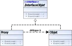 - Ce patron est un substitut d'un objet, qui permet de contrôler l'utilisation de ce dernier[11]. Un proxy est un objet destiné à protéger un autre objet. Le proxy a la même interface que l'objet à protéger. Un proxy peut être créé par exemple pour permettre d’accéder à distance à un objet (via un middleware). Le proxy peut également être créé dans le but de retarder la création de l'objet protégé — qui sera créé immédiatement avant d'être utilisé. Dans sa forme la plus simple, un proxy ne protège rien du tout et transmet tous les appels de méthode à l'objet cible[14].