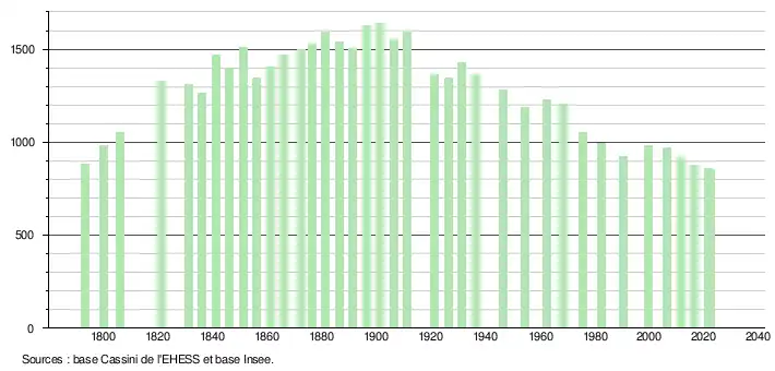 L'évolution du nombre d'habitants est connue à travers les recensements de la population effectués dans la commune depuis 1793. Pour les communes de moins de 10 000 habitants, une enquête de recensement portant sur toute la population est réalisée tous les cinq ans, les populations de référence des années intermédiaires étant quant à elles estimées par interpolation ou extrapolation[20]. Pour la commune, le premier recensement exhaustif entrant dans le cadre du nouveau dispositif a été réalisé en 2006[21].