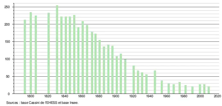 - ↑ Par convention dans Wikipédia, le principe a été retenu de n’afficher dans le tableau des recensements et le graphique, pour les populations légales postérieures à 1999, que les populations correspondant à une enquête exhaustive de recensement pour les communes de moins de 10 000 habitants, et que les populations des années 2006, 2011, 2016, etc. pour les communes de plus de 10 000 habitants, ainsi que la dernière population légale publiée par l’Insee pour l'ensemble des communes.
