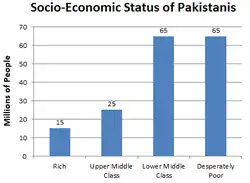 La pauvreté au Pakistan est un problème endémique du pays qui toucherait entre un quart et plus d'un tiers de la population selon les périodes et les indicateurs, bien qu'en forte baisse depuis le début des années 2000. Le Pakistan est confronté à une économie fragile et une démographie vigoureuse. Une forte corruption et la priorité donnée aux dépenses militaires a entrainé un fort retard dans le développement civil du pays.