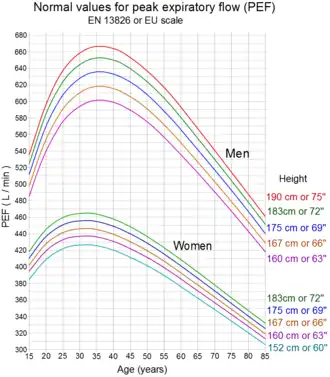 Il y a un certain nombre d'échelles non équivalentes utilisées dans la mesure du débit de pointe[4]. Des graphiques ou des tableaux sont disponibles qui prédisent des valeurs normales fondées sur le sexe d'une personne, l'âge et la hauteur, et des calculateurs en ligne sont disponibles[5]. Il y a une grande variation naturelle dans les résultats de sujets en bonne santé.