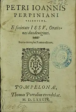 - Orationes duodeviginti, Rome 1587, in-8°, par les soins du P. Torsellini. Il y a eu depuis beaucoup d’éditions de ce recueil, une entre autres à Paris, juxta exemplar Romæ editum, 1588 in-8, chez Jean Corbon, une à Lyon en 1594, Hugues de La Porte, avec une épître dédicatoire du P. Francesco Benci à Edouard Farnèse et une préface du P. Torsellini. Moréri parle d'une édition faite aussi à Lyon en 1603 ; tout ce qu'il en dit convient à celle que nous venons de décrire. Il ne faudrait pas prendre pour une réimpression des harangues de Perpiñán le volume in-12 qui porte ce titre : Petri Joannis Perpiniani Valentini, e societate Jesu, orationes duodeviginti, Douai, Jean Bogard, 1598. Ce n'est que le frontispice de l'édition de Lyon, apposé au discours de Muret.