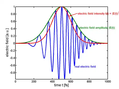 Lorsque cette relation est utilisée en physique des lasers pour décrire un spectre, il doit être considéré la fréquence porteuse du laser , l'enveloppe du spectre et un possible décalage de phase entre la porteuse et l'enveloppe. Le champ électrique du spectre s'écrit alors :