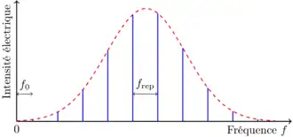 Une impulsion isolée d'un laser à modes bloqués présente un spectre continu. Toutefois, le spectre associé au train d'impulsions délivré par le même laser présente une structure en forme de peigne. L'explication se situe au niveau du fait qu'un train d'impulsions peut être considéré comme la convolution d'une impulsion isolée avec un peigne de Dirac. En prenant ensuite la transformée de Fourier d'un tel ensemble, nous obtenons que le spectre dispose d'une forme de peigne car la transformée de Fourier d'un peigne de Dirac est un peigne de Dirac (voir l'article sur le peigne de Dirac pour la démonstration mathématique). De plus, le résultat montre que l'enveloppe du peigne est égale à l'enveloppe du spectre d'une impulsion isolée.