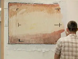 Un employé de la section des télécommunications de la mission Mariner 4 de la NASA dessine sur une surface à l'aide des numéros imprimés. Il s'agit de la première photo couleur de la planète Mars envoyée par la sonde spatiale en 1965. À proprement parler, c'est un dessin réalisé avec des crayons de couleur, plutôt qu'une peinture.
