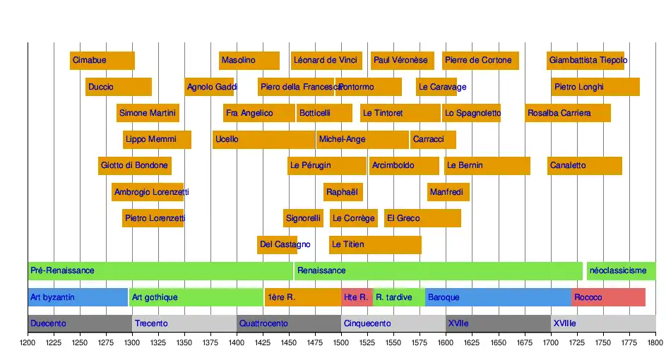 On distingue en général deux grandes périodes dans la Renaissance italienne. La première Renaissance, qui s'étend de 1400 à 1450, a pour capitale Florence et se caractérise par la volonté de se dégager des principes médiévaux pour revenir aux modèles antiques[48]. Les peintres majeurs de cette période ont pour nom Masaccio, Piero della Francesca, Le Verrocchio ou encore Fra Angelico. La seconde période est la haute Renaissance qui débute en 1450 pour finir en 1520, et se situe essentiellement à Rome. C'est l'époque des grands projets, des peintures monumentales et des chefs-d'œuvre produits par des artistes tels que Léonard de Vinci, Raphaël, Michel-Ange, Le Titien, Le Corrège ou Véronèse notamment[49].