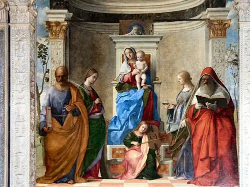 À cette époque, les territoires qui jouxtent ou qui sont intégrés progressivement à la république de Venise, offrent à tous les peintres l'occasion de contacts culturels, comme avec les humanistes de la cour de Ferrare[12]. Leurs recherches sur la perspective géométrique, celles de Leon Battista Alberti en particulier, vont atteindre ainsi Jacopo Bellini, qui se passionne pour les dessins d'architecture en perspective, et le transmettre à son atelier, surtout à son fils Giovanni. Le gendre de Jacopo Bellini, Andrea Mantegna, lui aussi passionné de géométrie perspective, artiste padouan et non vénitien, mais donc très proche des Bellini, trouva dans les sculptures du florentin Donatello à Padoue (en particulier le monument équestre à Gattamelata) le goût tout à fait « Renaissance » des monuments antiques, leur décor, et comparer ce que l'artiste pouvait observer sur le modèle vivant, au naturel, et sur le modèle antique, idéalisé. Le retable de San Zeno à Vérone, de 1559, en est la forme la plus explicite. Mantegna y démontre qu'il assimile le monde antique contemporain de la vie du Christ et sa représentation en perspective pour le spectateur moderne. C'est ce qu'il fait dans ses dessins, ses peintures et leurs encadrements en relief, mais aussi en réalisant les toutes premières gravures en taille-douce de grande taille, d'un travail méticuleux et qui, tirées en grand nombre, circulèrent jusqu'au-delà des Alpes, dans les mains de Dürer. L'architecture représentée en relief dans l'encadrement du polyptyque de Vérone se prolonge par sa représentation en perspective à l'intérieur de la peinture. On retrouve ce passage entre l'espace du spectateur et l'espace de la représentation sacrée, comme une fenêtre ouverte, dans le retable installé à San Zaccaria[13] en 1505 par Giovanni Bellini. Celui-ci avait su faire la synthèse de tous ces mouvements dans la culture et dans la pratique des peintres du XVe siècle. Il était, alors, le peintre le plus admiré de Venise.