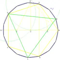 En reportant 14 fois la longueur AB sur le cercle, on obtient le polygone régulier ABCDEFGHIJKLMNP. Une telle construction a été proposée par Euclide.