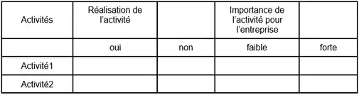 Chaque activité est donc évaluée sur les critères de réalisation et de son importance pour l’entreprise. Les activités listées dans le tableau précédent sont ensuite comparées aux pratiques réelles dans les entreprises pour déterminer un taux d’activité. Pour aller plus loin, les activités sont jugées en fonction de leur réalisation et de leur importance par l'affectation d'un coefficient.
