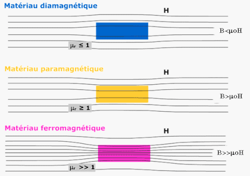 On distingue les matériaux diamagnétiques (argent, cuivre, eau, or, plomb, zinc...), paramagnétiques (air, aluminium, magnésium, platine...) et ferromagnétiques (cobalt, fer, mu-métal, nickel...).