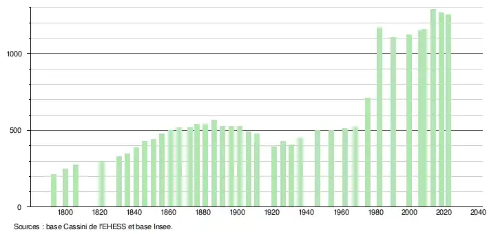 L'évolution du nombre d'habitants est connue à travers les recensements de la population effectués dans la commune depuis 1793. Pour les communes de moins de 10 000 habitants, une enquête de recensement portant sur toute la population est réalisée tous les cinq ans, les populations de référence des années intermédiaires étant quant à elles estimées par interpolation ou extrapolation[15]. Pour la commune, le premier recensement exhaustif entrant dans le cadre du nouveau dispositif a été réalisé en 2008[16].