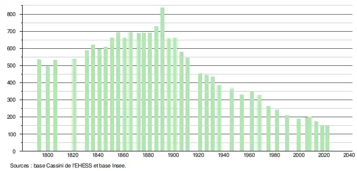 L'évolution du nombre d'habitants est connue à travers les recensements de la population effectués dans la commune depuis 1793. Pour les communes de moins de 10 000 habitants, une enquête de recensement portant sur toute la population est réalisée tous les cinq ans, les populations de référence des années intermédiaires étant quant à elles estimées par interpolation ou extrapolation[15]. Pour la commune, le premier recensement exhaustif entrant dans le cadre du nouveau dispositif a été réalisé en 2008[16].