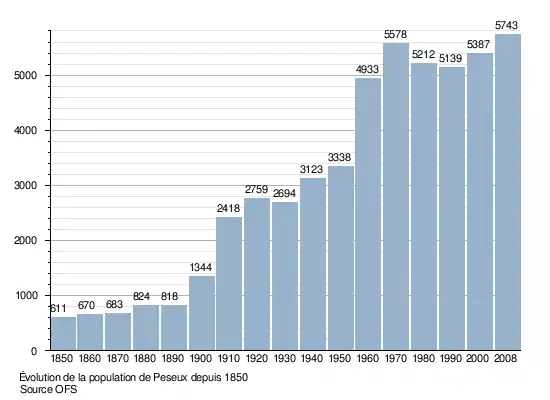 Le graphique suivant résume l'évolution de la population de Peseux entre 1850 et 2008[7] :