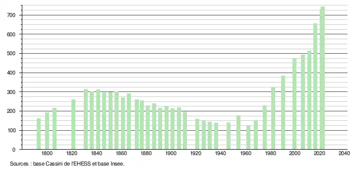 L'évolution du nombre d'habitants est connue à travers les recensements de la population effectués dans la commune depuis 1793. Pour les communes de moins de 10 000 habitants, une enquête de recensement portant sur toute la population est réalisée tous les cinq ans, les populations de référence des années intermédiaires étant quant à elles estimées par interpolation ou extrapolation[29]. Pour la commune, le premier recensement exhaustif entrant dans le cadre du nouveau dispositif a été réalisé en 2006[30].