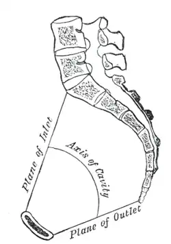 - le détroit supérieur (Apertura Pelvis superior) formé d'avant en arrière, du bord supérieur de la symphyse pubienne, la crête pectinéale, la ligne arquée et le promontoire du sacrum. Il forme, dans un plan fortement oblique en bas et en avant, une figure en forme de cœur chez 50 % des femmes, une forme ovoïde chez 25 % des femmes et une forme triangulaire chez 25 % des femmes et chez la majorité des hommes. La forme la plus favorable à l'accouchement est la forme "cartageux" (en forme de cœur), la moins favorable étant la triangulaire ;