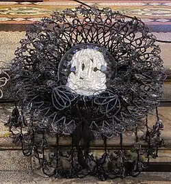 Cette petite structure de fer forgé (plus haute et large qu'épaisse) se présentait comme un toit en bâtière dont les 2 pentes sont constituées de vitres maintenues dans leurs cadres métalliques par du mastic. Ce toit avait pour fonction d'abriter des plus fortes intempéries les couronnes (de fleurs naturelles ou de perles) qui y étaient accrochées.
