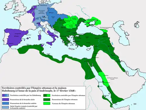 - La guerre entre les Habsbourg et les Ottomans. Elle voit s'opposer les ambitions de Soliman le Magnifique à celles de Ferdinand Ier puis de Maximilien II en Europe centrale.