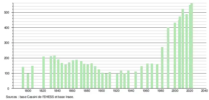 L'évolution du nombre d'habitants est connue à travers les recensements de la population effectués dans la commune depuis 1793. Pour les communes de moins de 10 000 habitants, une enquête de recensement portant sur toute la population est réalisée tous les cinq ans, les populations de référence des années intermédiaires étant quant à elles estimées par interpolation ou extrapolation[19]. Pour la commune, le premier recensement exhaustif entrant dans le cadre du nouveau dispositif a été réalisé en 2005[20].