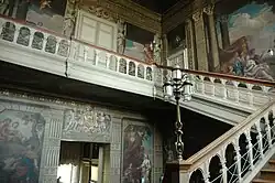 - Le grand escalier, qui mène des pièces principales du rez-de-chaussée aux pièces de l'étage, a été repeint par Louis Laguerre après un incendie entre 1715 et 1720.