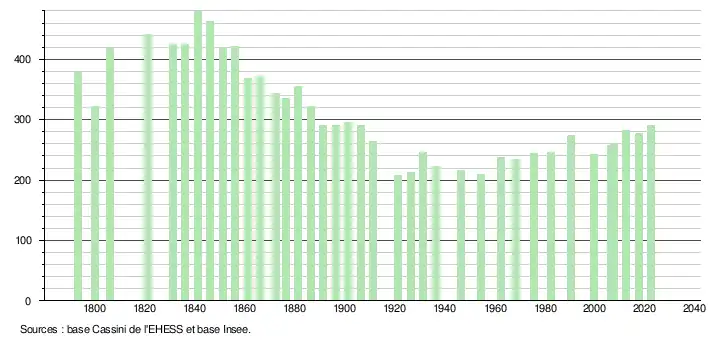 L'évolution du nombre d'habitants est connue à travers les recensements de la population effectués dans la commune depuis 1793. Pour les communes de moins de 10 000 habitants, une enquête de recensement portant sur toute la population est réalisée tous les cinq ans, les populations de référence des années intermédiaires étant quant à elles estimées par interpolation ou extrapolation[23]. Pour la commune, le premier recensement exhaustif entrant dans le cadre du nouveau dispositif a été réalisé en 2007[24].