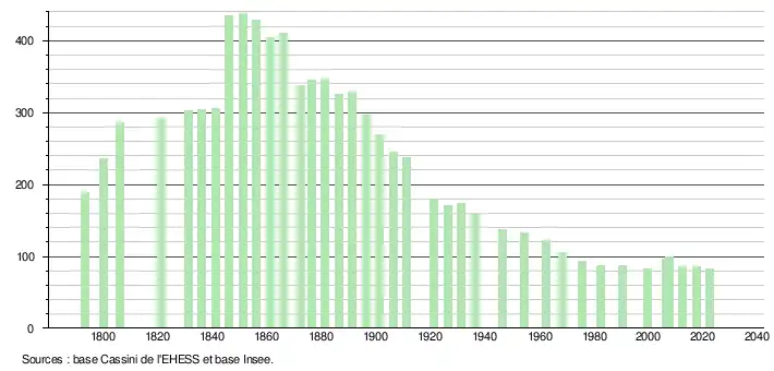 L'évolution du nombre d'habitants est connue à travers les recensements de la population effectués dans la commune depuis 1793. Pour les communes de moins de 10 000 habitants, une enquête de recensement portant sur toute la population est réalisée tous les cinq ans, les populations de référence des années intermédiaires étant quant à elles estimées par interpolation ou extrapolation[28]. Pour la commune, le premier recensement exhaustif entrant dans le cadre du nouveau dispositif a été réalisé en 2007[29].