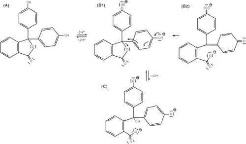 - II. Lors d'un ajout de base, le cycle lactone s'ouvre et évolue vers une structure triphénylcarbinol (non représentée) et cela amène la perte d'une molécule d'eau dans la structure et on forme une espèce ionique de couleur rouge pourpre (la longueur d'onde majoritairement absorbée se trouvant vers 550 nm). Cette espèce est décrite par deux formes mésomères (B1 et B2). La forme mésomère B2 laisse apparaître un système conjugué sur l'ensemble de la molécule. Ce système conjugué étendu est à l'origine de la coloration