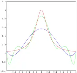 De plus, lorsque les nœuds d'interpolation sont équi-répartis, cela empire cette situation, comme cela est expliqué par la suite. En effet, dans un cadre plus général, l'interpolation lagrangienne sur des nœuds équidistants n'est pas la meilleure. En notant (li) la base des polynômes de Lagrange liée aux points (xi), on a :