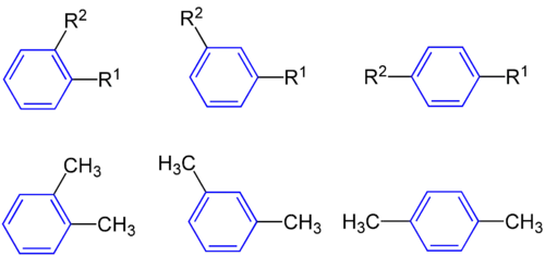 L'acide phtalique C6H4(COOH)2, l'anhydride phtalique, l'acide acétylsalicylique et l'acide paraaminobenzoïque sont des exemples de molécules contenant un groupe phénylène avec une configuration déterminée (ortho pour les trois premières, para pour la dernière).