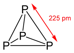 Le phosphore blanc, le phosphore jaune ou tétraphosphore (P4) existe en tant que molécules composées de 4 atomes. L'arrangement tétraédrique résulte en une contrainte circulaire qui favorise l'instabilité. La molécule possède 6 liens P-P simples. Il existe deux formes cristallines. La forme α, qui est stable aux conditions normales de pression et de température, est cubique à faces centrées. À 192,5 kelvins, elle se transforme de façon réversible en forme β. Cette dernière aurait une structure cristalline hexagonale[1].