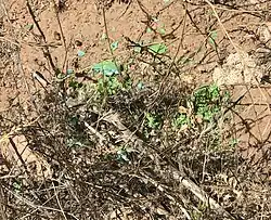 Un sachet en plastique vert pour déchets canins après trois mois d'exposition avec très peu de précipitations.