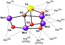 Sa structure a été résolue en 2011 avec une résolution de 1,9 Å, ce qui a révélé la présence de cinq atomes d'oxygène servant de ponts oxo entre les cinq atomes métalliques et quatre molécules d'eau liées au cluster Mn4CaO5. Plus de 1 300 molécules d'eau ont été trouvées dans chaque photosystème II, certaines formant de grands réseaux par liaison hydrogène qui pourraient servir de canaux à protons H+, à molécules d'eau H2O ou à oxygène O2[5].