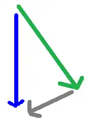 La pierre bleue est collée à la pierre rouge, vers le haut des anneaux. La flèche rouge au-dessus indique où la pierre rouge est frappée. La flèche brune indique dans quelle direction la même pierre rouge voyage. Normalement, la pierre bleue irait dans la direction de la flèche verte mais comme elle était collée à la pierre rouge, il y a un effet de traînage et elle va être tirée dans la même direction que la pierre rouge, tel qu’indiqué par la flèche grise. En additionnant les vecteurs, on peut voir dans quelle direction la pierre bleue voyage exactement, et c’est indiqué par la flèche bleue. Ceci force une collision entre la pierre bleue et la pierre rouge qui se trouvait au milieu des anneaux.