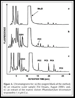 La technique analytique la plus sensible pour détecter les phytochélatines dans les phytoplanctons des eaux naturelles est celle de HPLC couplée d'un détecteur de fluorescence dont la limite de détection est de l’ordre de pM.