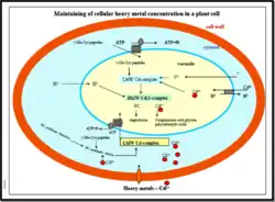 La phytochélatine (PC) possède des domaines de reconnaissances qui sont reconnus par les vacuoles d’une cellule. Ainsi, le complexe PC-Ion métallique est capté et transporté dans la vacuole par le biais d’un transport actif utilisant un transporteur spécifique aux phytochélatines et l’ATP. Dans la vacuole, les phytochélatines sont dégradées en acides aminés et les ions métalliques sont alors fixés par liaison à des acides organiques.