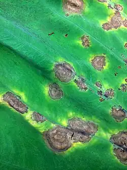 Un signe marquant d'une infection par Phytophthora colocasiae est la formation d'anneaux blancs poudreux contenant des masses de sporanges pathogènes. Ces anneaux se forment par temps pluvieux ou humide autour des lésions avancées[2].