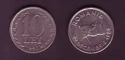 23,0 mm | 4,65 g | acier plaqué nickel | un drapeau et un épi de blé, avec les mentions ROMANIA et 22 DECEMBRIE 1989. | la valeur faciale 10 LEI, deux branches d'olivier et le millésime | 1990 | |