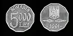 24 mm | 2,50 g | le blason de la Roumanie et le millésime | la valeur faciale 5000 LEI et la mention ROMANIA | 2001 | ||