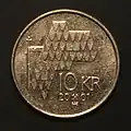 Le toit d'une Stavkirke, église médiévale, la valeur faciale 10 KR et le millésime | ![]() |