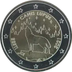 En ombre chinoise, un loup hurlant sur un rocher, devant une forêt de pins et un ciel étoilé. En haut, la légende, en latin, CANIS LUPUS. En bas, sur le rocher, la mention du pays émetteur EESTI suivie du millésime 2021. L'anneau externe de la pièce comporte les douze étoiles du drapeau européen.