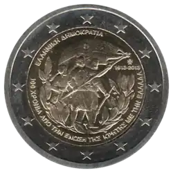 • pièce de 2 euros/ευρώ : l'enlèvement d'Europe par Zeus, métamorphosé en taureau, selon une mosaïque de Sparte. En haut à gauche, la légende ΕΥΡΩΠΗ (Europe). En dessous, la valeur nominale en grec, 2 ΕΥΡΩ. Le tout est entouré des 12 étoiles du drapeau européen, entre lesquels est indiqué le millésime en deux parties, sur l'anneau extérieur.