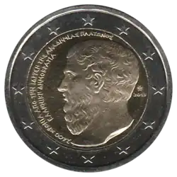 L'effigie de Platon, à gauche de laquelle on peut lire 2 400 ΧΡΟΝΙΑ ΑΠΟ ΤΗΝ ΙΔΡΥΣΗ ΤΗΣ ΑΚΑΔΗΜΙΑΣ ΠΛΑΤΩΝΟΣ (2400 ans depuis la fondation de l'Académie de Platon) et le nom du pays émetteur ΕΛΛΗΝΙΚΗ ΔΗΜΟΚΡΑΤΙΑ. À droite le millésime 2013. L'anneau externe de la pièce comporte les douze étoiles du drapeau européen.