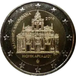 Représentation de la façade de l'église du Monastère d'Arkadi. En bas, la légende ΜΟΝΗ ΑΡΚΑΔΙΟΥ (Monastère d'Arkadi). À gauche, la mention du pays émetteur ΕΛΛΗΝΙΚΗ ΔΗΜΟΚΡΑΤΙΑ. En haut, le millésime 2016. L'anneau externe de la pièce comporte les douze étoiles du drapeau européen.