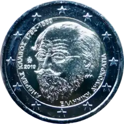 Effigie d'Andreas Calvos tournée vers la gauche. À gauche, son nom ΑΝΔΡΕΑΣ ΚΑΛΒΟΣ suivi de ses années de naissance et de mort 1792-1869. À la hauteur de ses yeux, le millésime 2019. À droite, la mention du pays émetteur ΕΛΛΗΝΙΚΗ ΔΗΜΟΚΡΑΤΙΑ. L'anneau externe de la pièce comporte les douze étoiles du drapeau européen.