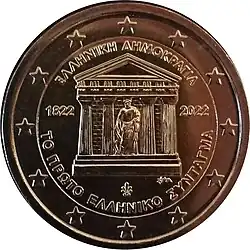 Le dessin représente le drapeau grec dans un cercle, au centre, entouré de six branches de laurier. L'inscription 1821–2021 200 ΧΡΟΝΙΑ ΑΠΟ ΤΗΝ ΕΛΛΗΝΙΚΗ ΕΠΑΝΑΣΤΑΣΗ (1821-2021 Bicentenaire de la Révolution grecque) et la mention du pays émetteur ΕΛΛΗΝΙΚΗ ΔΗΜΟΚΡΑΤΙΑ figurent en cercle le long du bord. L’anneau extérieur de la pièce comporte les douze étoiles du drapeau européen.