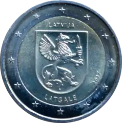 L'écusson de la région de Latgale au-dessus du nom de la région LATGALE et en dessous de la mention du pays émetteur LATVIJA. À droite, le millésime 2017. L'anneau externe de la pièce comporte les douze étoiles du drapeau européen.