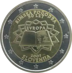 Tous les pays de la zone euro, dont la Slovénie, ont émis le 25 mars 2007 une pièce commémorative de 2 € pour célébrer le 50e anniversaire du traité de Rome. Le centre de la pièce représente le traité signé par les six États membres fondateurs devant un arrière-plan évoquant le dallage, dessiné par Michel-Ange, de la place du Capitole, à Rome, où le traité a été signé le 25 mars 1957. Le mot EVROPA (Europe) figure au-dessus du livre. La légende RIMSKA POGODBA (Traité de Rome) et 50 LET (50 ans) est inscrite au-dessus du dessin. Le millésime 2007 et le nom du pays émetteur SLOVENIJA sont inscrits sous le dessin. L'anneau externe de la pièce comporte les douze étoiles du drapeau européen. | ||||||