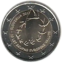 Tous les pays de la zone euro ont émis le 1er janvier une pièce commémorative de 2 € pour célébrer le 10e anniversaire de l'Union économique et monétaire. Le centre de la pièce illustre une silhouette humaine stylisée dont le bras gauche est prolongé par le symbole de l'euro. Le nom du pays émetteur SLOVENIJA apparaît dans la partie supérieure, tandis que l'indication 1999-2009 et l'acronyme EMU (pour Ekonomska in monetarna unija, Union économique et monétaire ou UEM) apparaissent dans la partie inférieure. L'anneau externe de la pièce représente les douze étoiles du drapeau européen. | ||||||