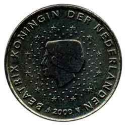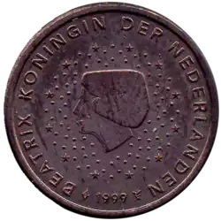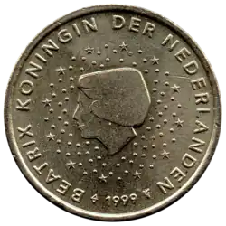 - Pièces de 1 à 50 centimes : L'effigie stylisée de Beatrix, Reine des Pays-Bas, tournée vers la gauche et entourée de points et des 12 étoiles du drapeau européen. Le pourtour reprend la légende BEATRIX KONINGIN DER NEDERLANDEN (Beatrix Reine des Pays-Bas), complétée en bas par le millésime.