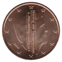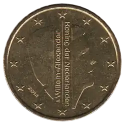 - Pièces de 1 à 50 cents/centimes : L'effigie stylisée de Willem-Alexander, Roi des Pays-Bas, tournée vers la droite. Un double bandeau traverse verticalement l'effigie avec la légende Willem-Alexander Koning der Nederlanden (Willem-Alexander Roi des Pays-Bas). En bas à gauche, le millésime. Le tout est entouré des 12 étoiles du drapeau européen.
