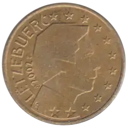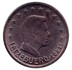 Sur les pièces de 1 et 2 euros, les étoiles sont disposées comme sur le drapeau européen. La partie arrière de l'effigie est masquée par le nom du pays émetteur LËTZEBUERG et le millésime.